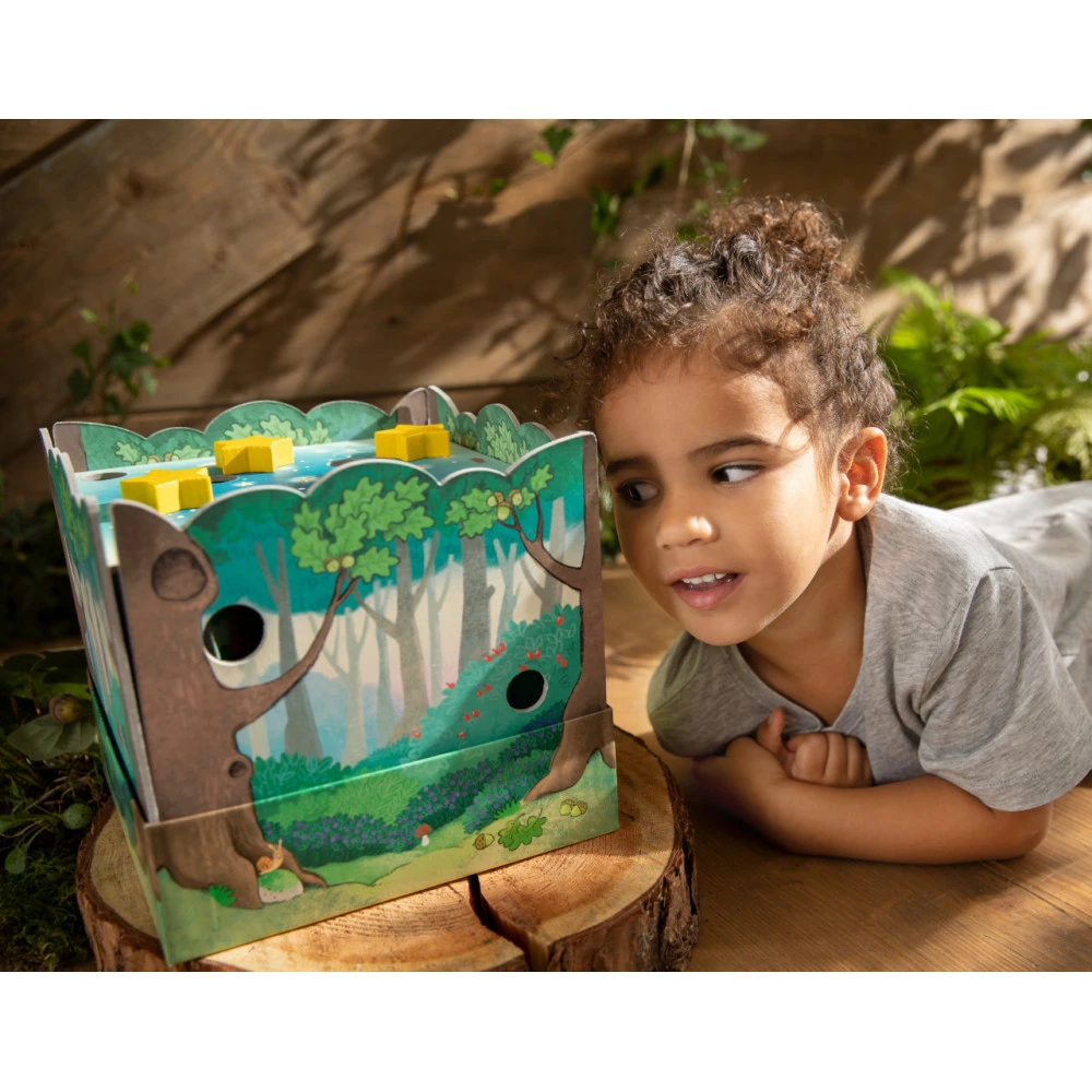 Contient le décor de forêt en 3D, la figurine souris sarah, 8 étoiles en bois, 8 tuiles animaux et la règle de jeu.