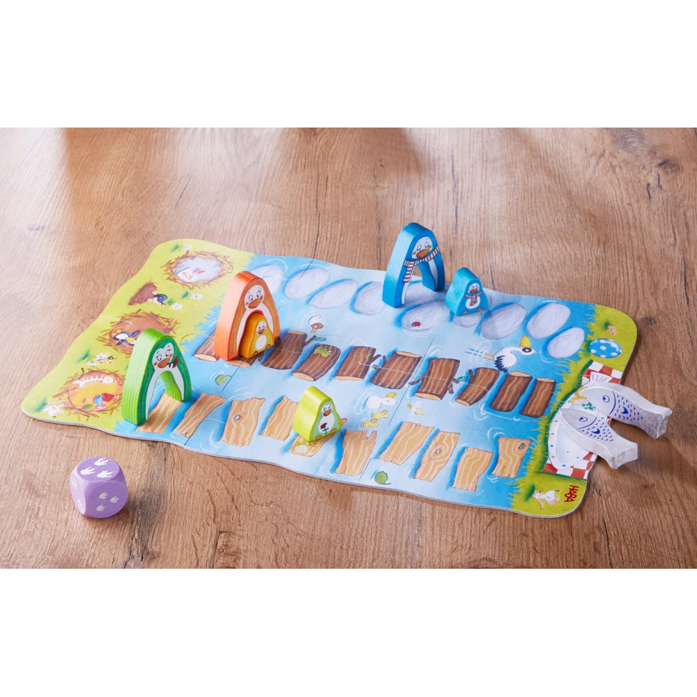 Dans la collection « Mes premiers jeux » de chez HaBa, découvrez « Vite, Vite, petit pingouin! », un jeu de course où maman pingouin et son petit vont traverser le bras de mer pour aller chercher de délicieux poissons.