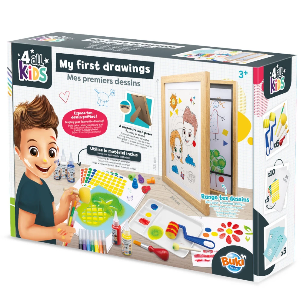 Contenu de la boîte : 5 flacons de peinture, 1 palette, 2 rouleaux en mousse, 2 tampons en mousse, 2 pinceaux, 5 pochoirs, 5 feuilles d’autocollants, 10 feuilles cartonnée A4 , 1 boîte en bois qui sert de cadre A4, 8 stylos à pointe ronde, 5 tampons et 1 livret explicatif en couleur