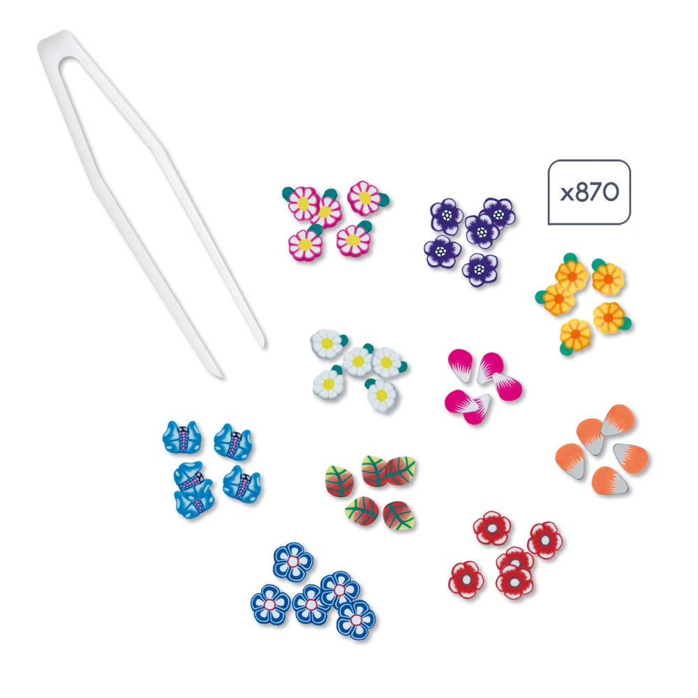 Vous connaissez les mini-canes ? Ce sont des petites tranches de polymères, ici en forme de fleurs et de papillons que l’on vient coller sur les tableaux en s’aidant d’une pince.