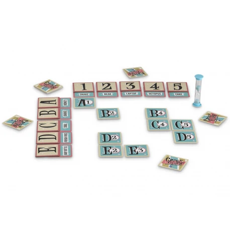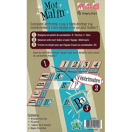 On place des cartes sur la table pour former un tableau avec des lignes et des colonnes chacune avec un mot-clé. Chaque joueur pioche une carte coordonnée et on retourne le sablier. Chaque joueur doit aller faire deviner sa carte coordonnées en donnant un mot malin, c’est-à-dire un indice qui reprend un pint commun avec les 2 mots-clés associés