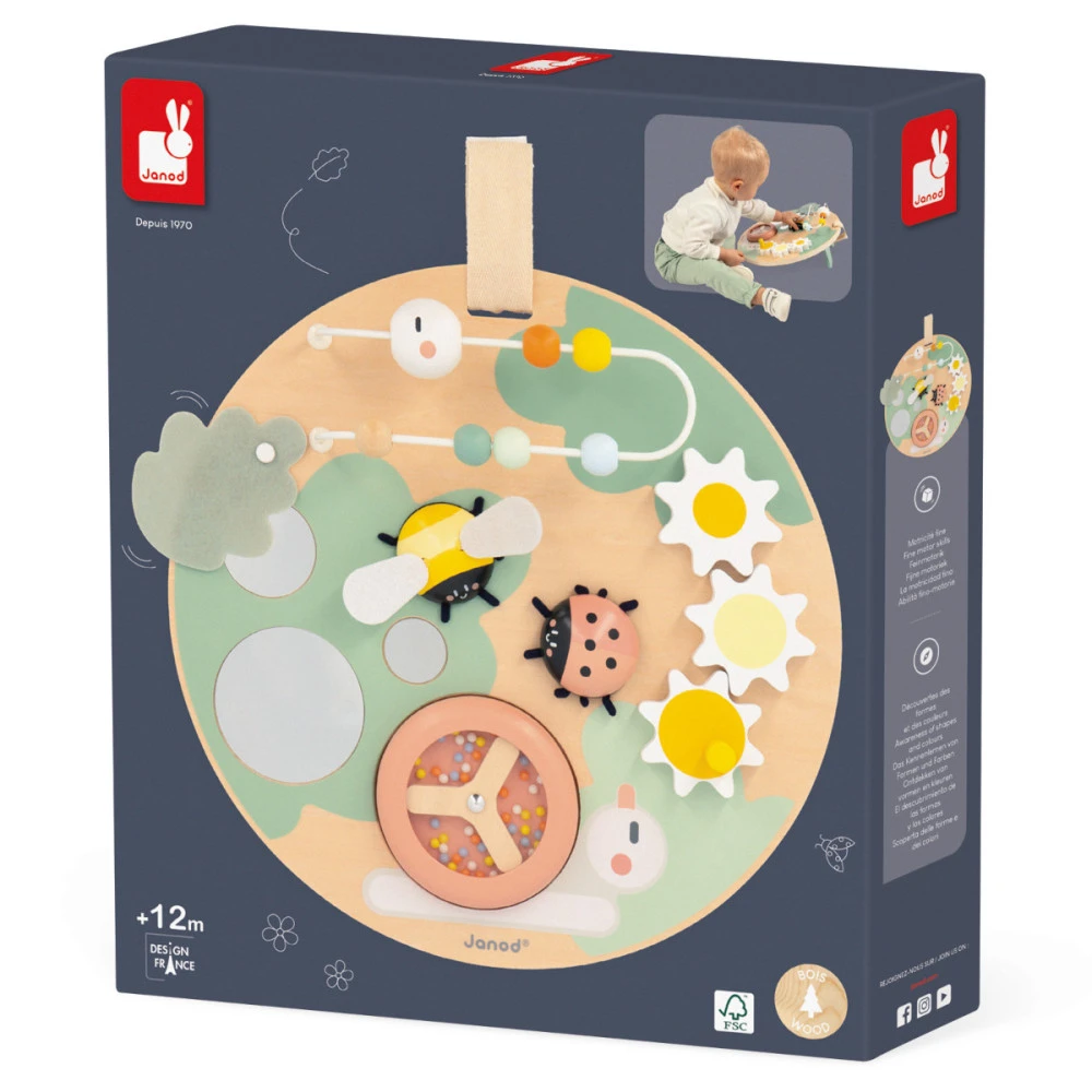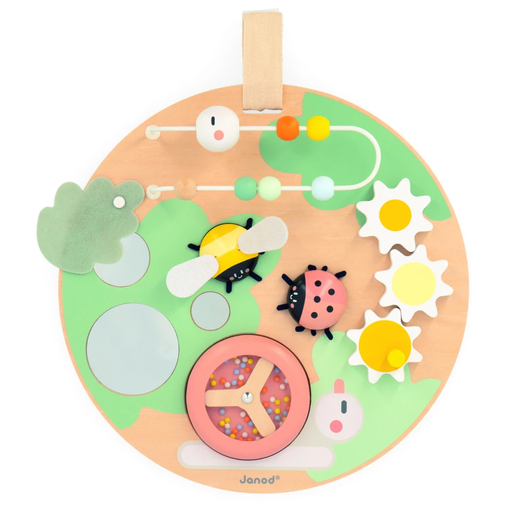 Panneau en bois avec différentes activités d’éveil (engrenages, boulier, perles, feutrine, petits bruits, miroir, etc.) à suspendre aux barreaux du parc ou à poser quand l’enfant peut rester assis