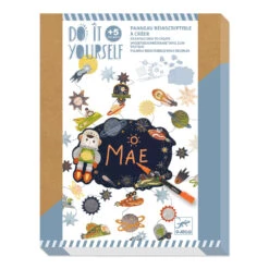 Contenu : 1 ardoise à décorer, 15 tiges semi-rigides colorées, plus de 50 décorations prédécoupées, 2 planches d’autocollants très épais et résistants, 1 crochet, 1 marqueur à craie effaçable à sec, 1 chiffon, 1 feuillet de pas-à-pas détaillé.