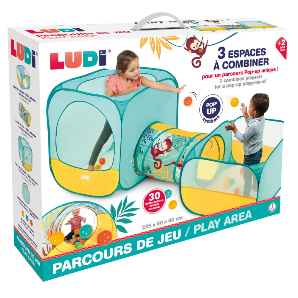 Parcours de jeu constitué de 3 modules pop-up illustrés sur le thème de la jungle : un cube, un tunnel et une aire à balles