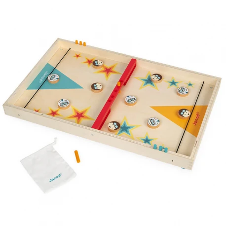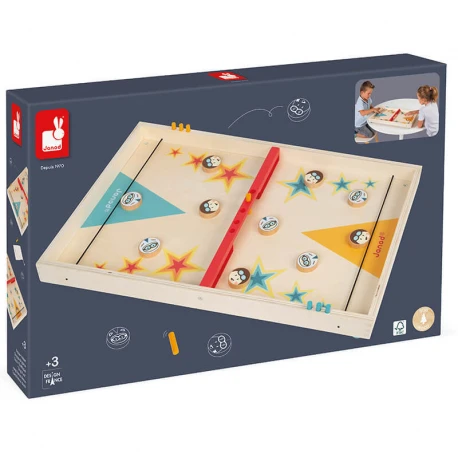 Contient un sac en coton pour ranger tous les accessoires : 2 x 5 palets et 8 jetons pour marquer les points dans les emplacements prévus sur le jeu.