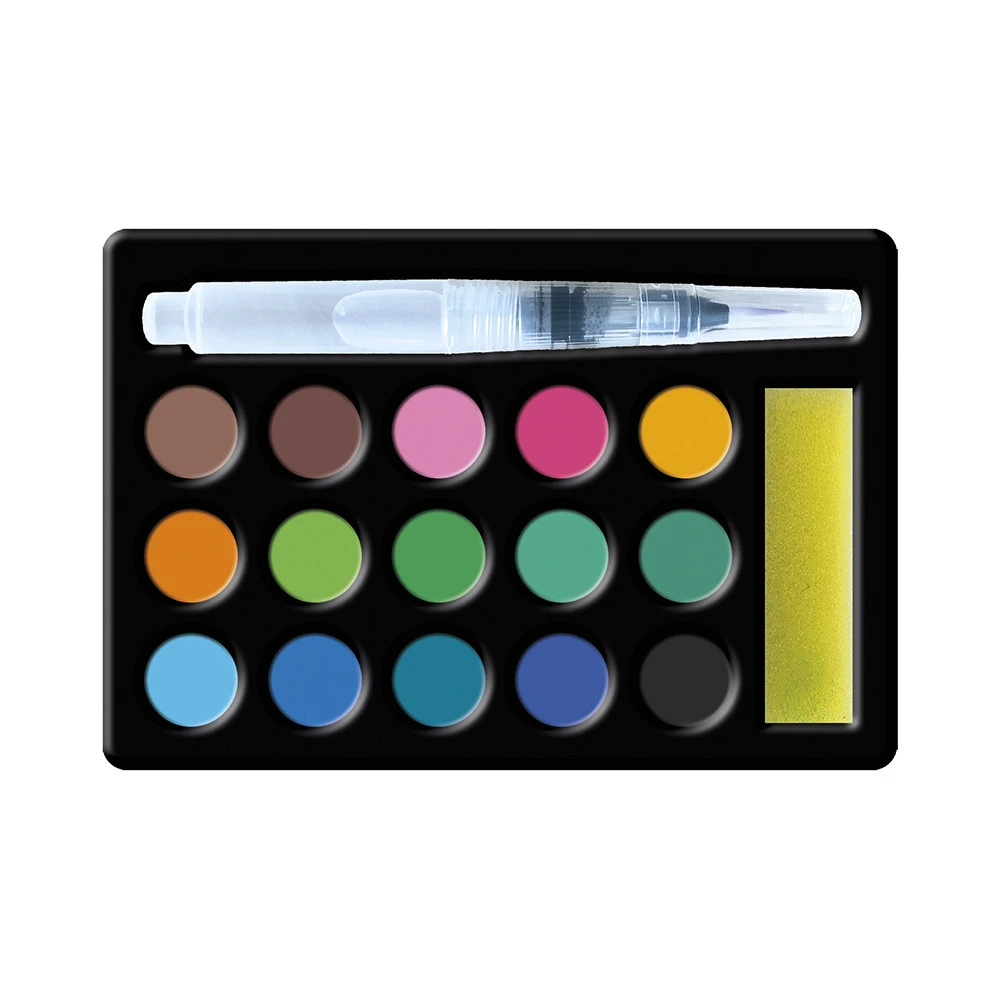 Contenu : 2 tableaux à peindre (dont 1 avec des détails en dorure), 1 palette avec 15 aquarelles, 1 éponge et 1 feutre pinceau avec réservoir d’eau) et 1 cadre à peindre