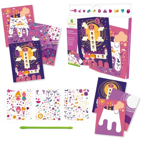 Contient 3 tableaux, plus de 100 décalcomanies, 1 outil et une notice explicative