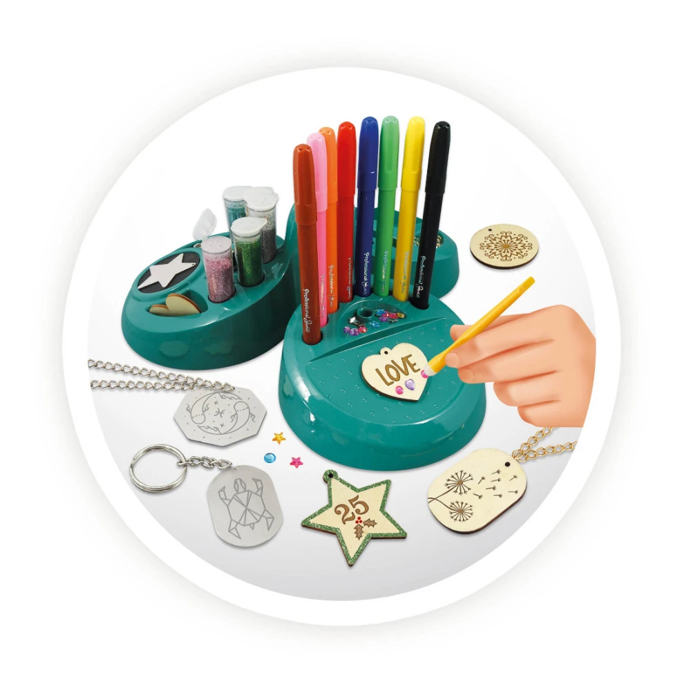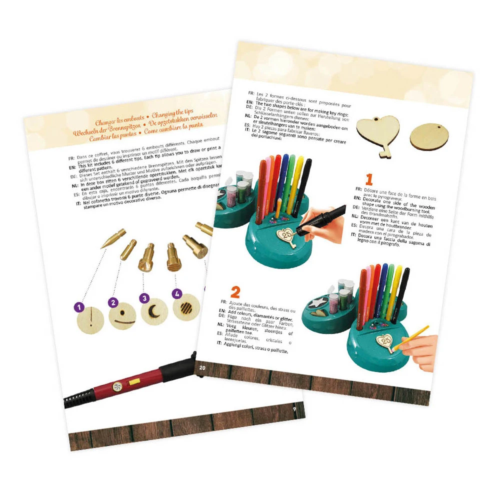 Une pince permet aux adultes de visser, en toute sécurité, un des 6 embouts fournis pour graver des motifs différents.
