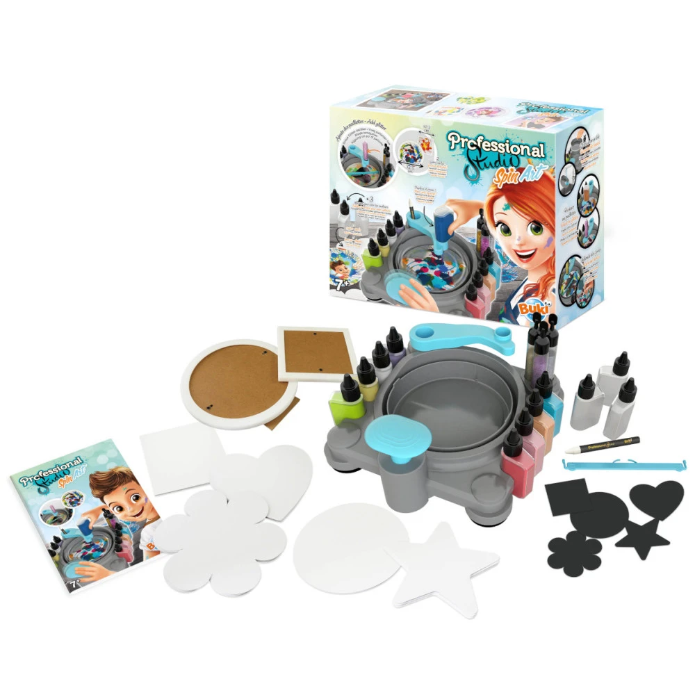 Avec le Professional Studio Spin Art de Buki, réalise grâce au plateau tournant des oeuvres originales avec de la peinture et des paillettes.