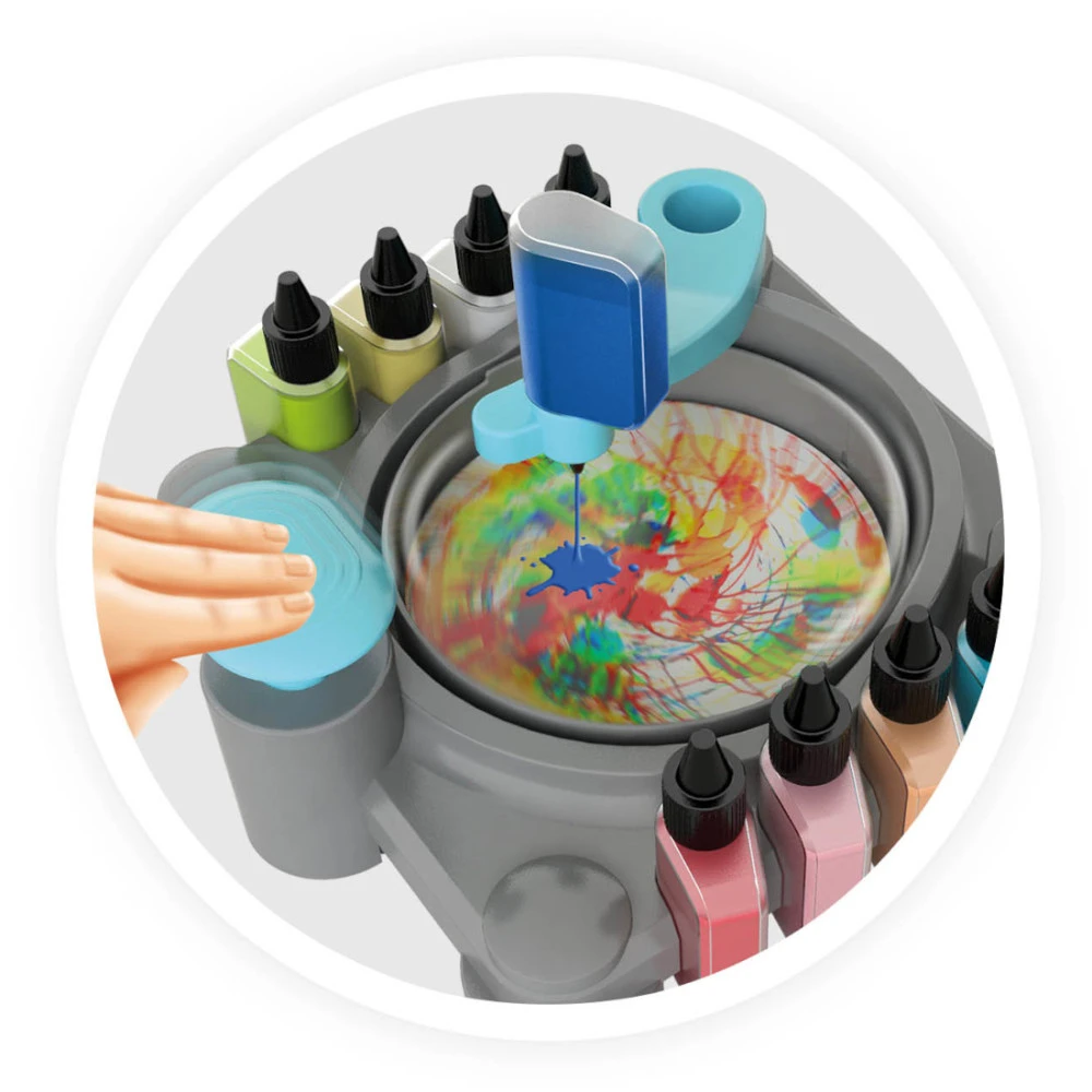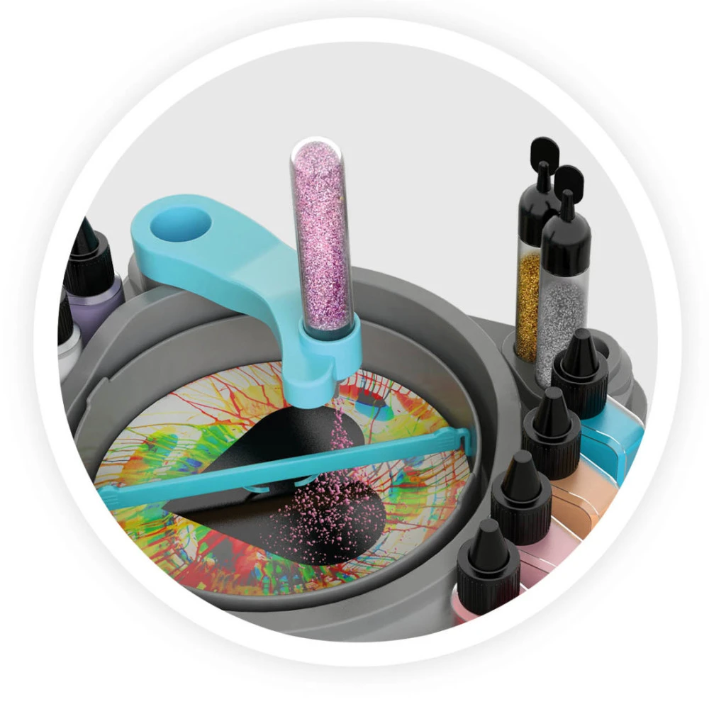 Place une feuille sur le plateau tournant, fais-le tourner et dépose la peinture de ton choix ou des paillettes grâce au bras amovible, pour une résultat impressionnant !