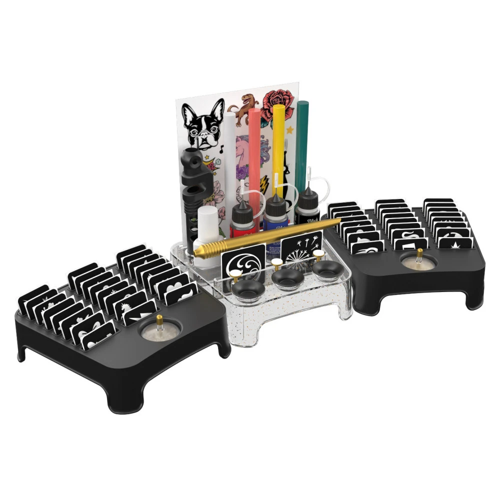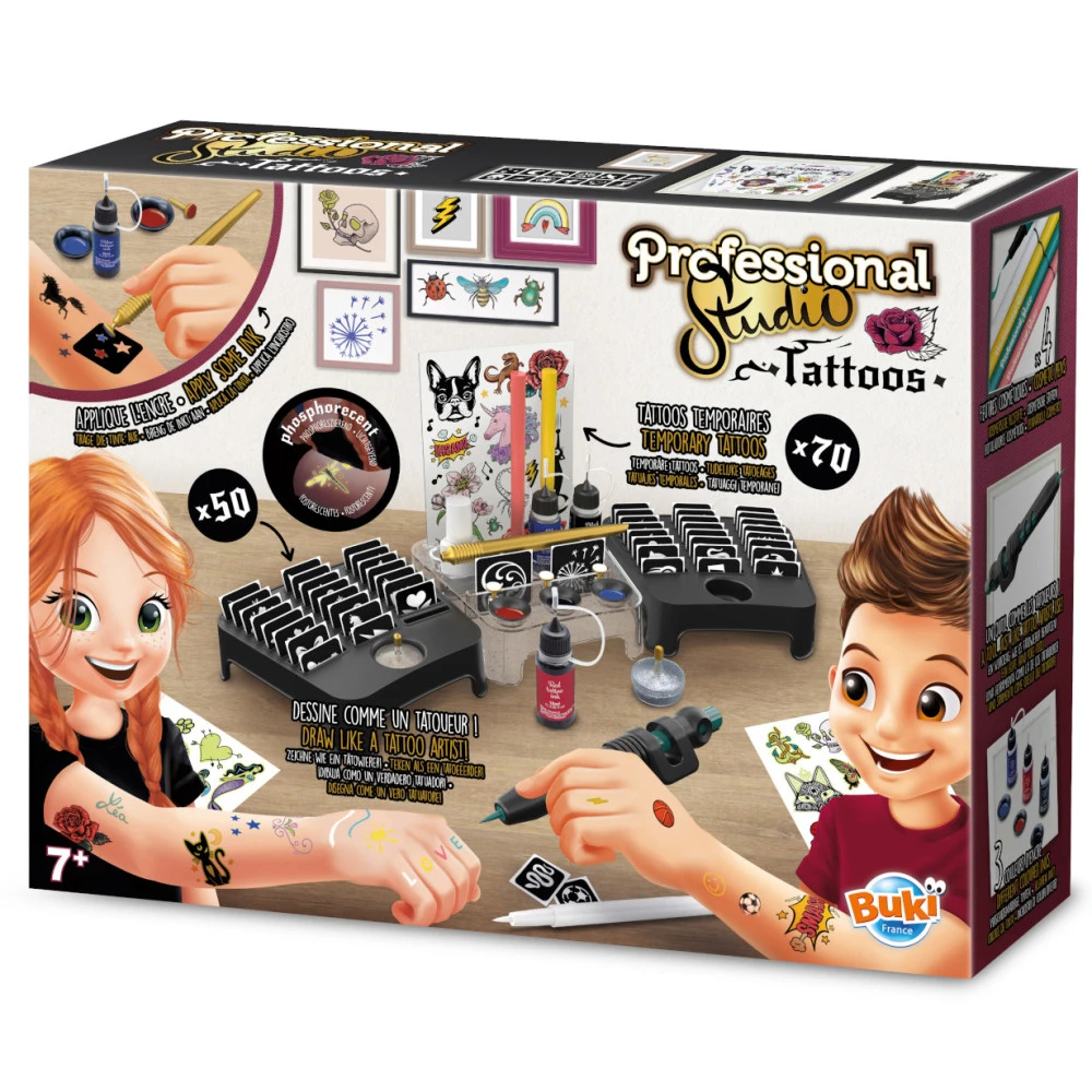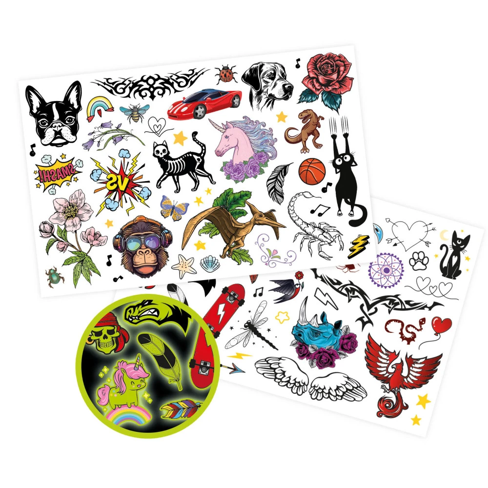 Contenu: une station avec 4 feutres cosmétiques, 3 tubes d’encre gel de 3 couleurs, 50 pochoirs repositionnables, 2 pots de paillettes et 1 colle cosmétique, 70 tattoos temporaires