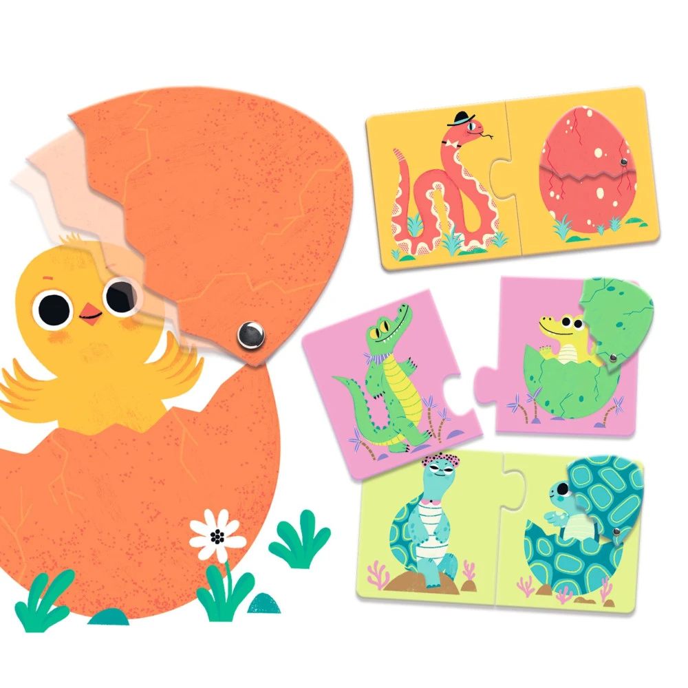 Avec ce puzzle duo articulo de Djeco, les enfants vont associer 2 à 2 les animaux avec leurs oeufs et ensuite, articuler les oeufs pour en découvrir le bébé qui se cache à l’intérieur.