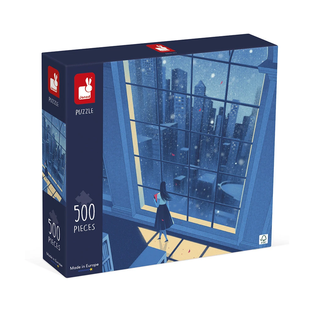 « La Nuit Bleue » est un joli puzzle Janod de 500 pièces d’une jeune fille admirant la ville à travers cette immense baie vitrée