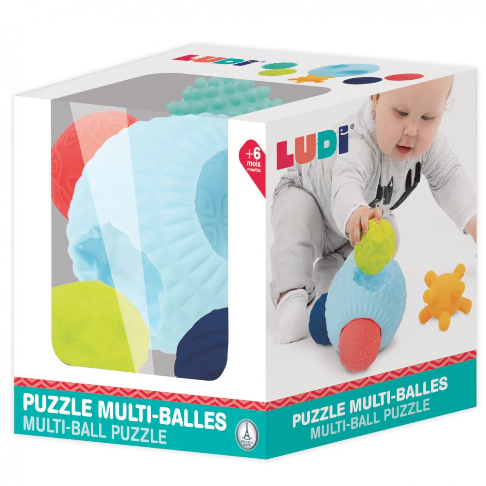 5 petites balles sensorielles (nervurées, lisses ou à picots) faciles à prendre en main viennent s’imbriquer dans une plus grande. L’enfant va apprendre à reconnaître les couleurs et les formes et à recomposer son puzzle en 3D.
