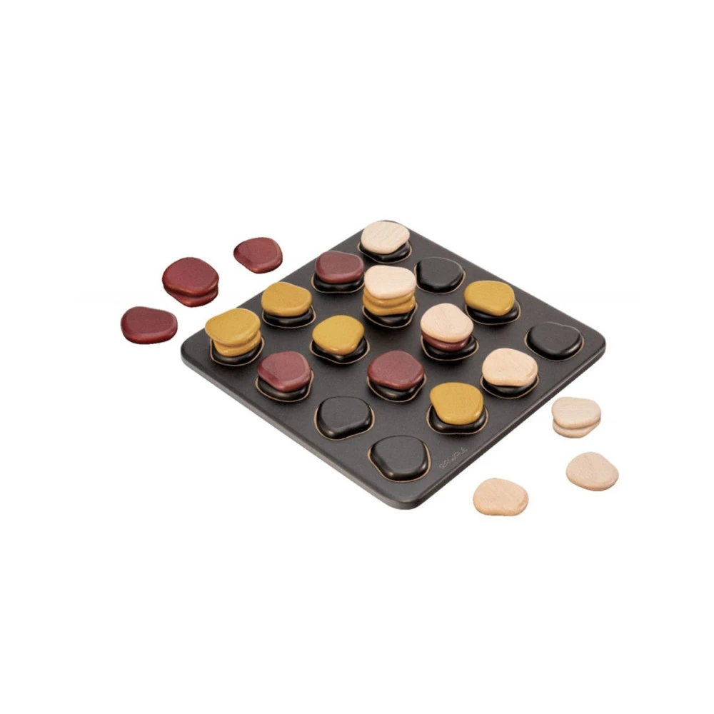 Contenu : 1 plateau, 24 galets en bois de 3 couleurs, 1 sac en tissu et la règle du jeu