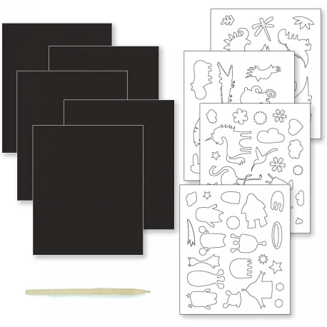 Contient 4 planches de pochoirs (17 x 20 cm) proposant 5 thèmes (les princesses, les monstres gentils, la ferme, les papillons et les fleurs), 5 feuilles à gratter (17 x 20 cm), 1 stylet en bambou et 1 livret explicatif