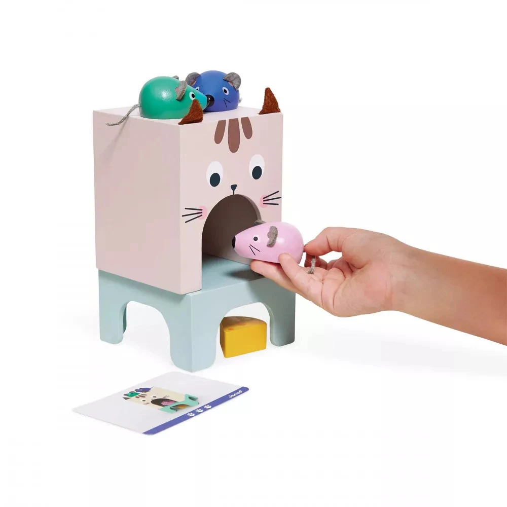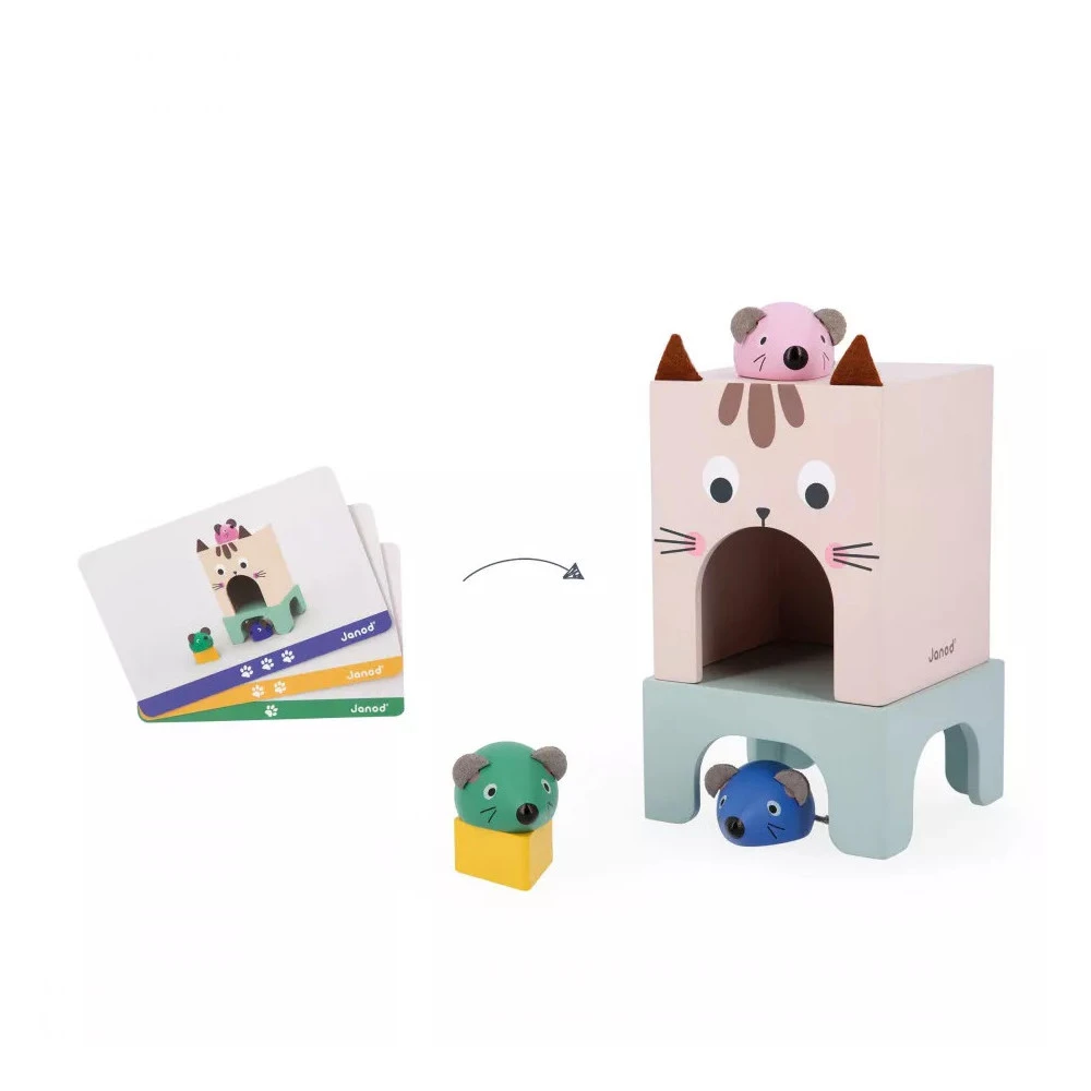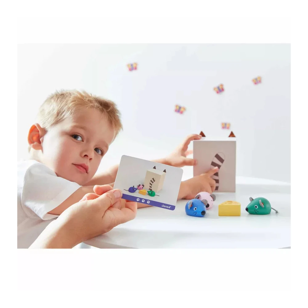 Découvrez le jeu éducatif en bois « Se repérer dans l’espace » sur le thème du chat et des souris de chez Janod.