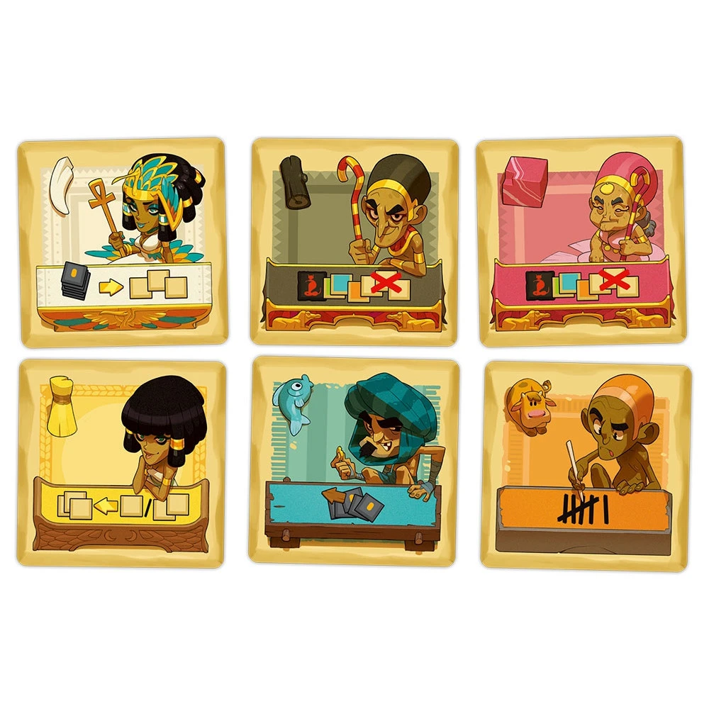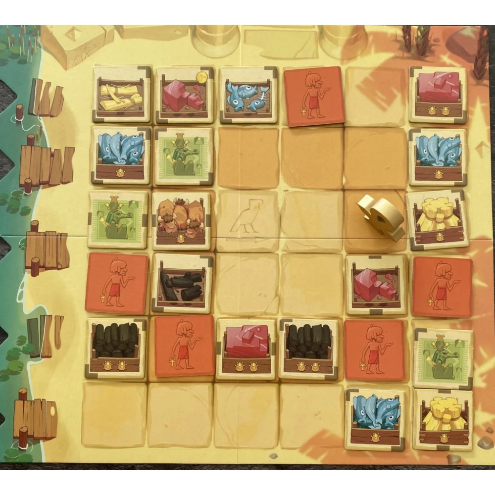 Dans ce jeu de placement de tuiles, vous allez récupérer des marchandises, gagner des jetons Deben, vendre des lots de minimum 3 marchandises identiques, choisir des jetons pyrogue ou encore défausser des cartes personnages et ce, jusqu’à ce qu’un des deux joueurs ne puisse plus jouer.