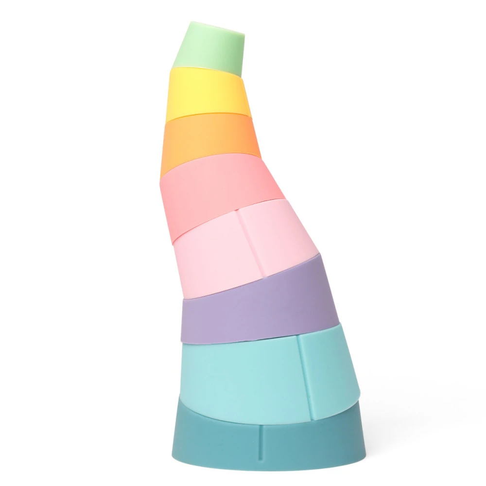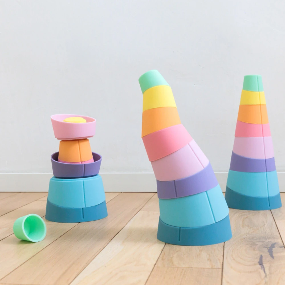 Stak de chez Oppi ce sont 8 pièces en silicone à emboîter et empiler d’un tas de manière différente.