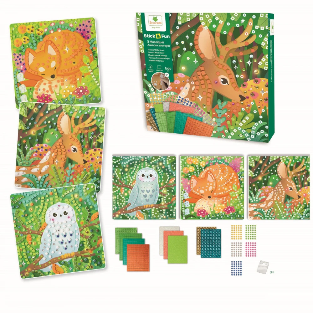 Coffret Stick & fun Au Sycomore pour réaliser 3 tableaux avec des animaux sauvages et ce, à l’aide de 950 mosaïques de formes différentes et de 50 strass.
