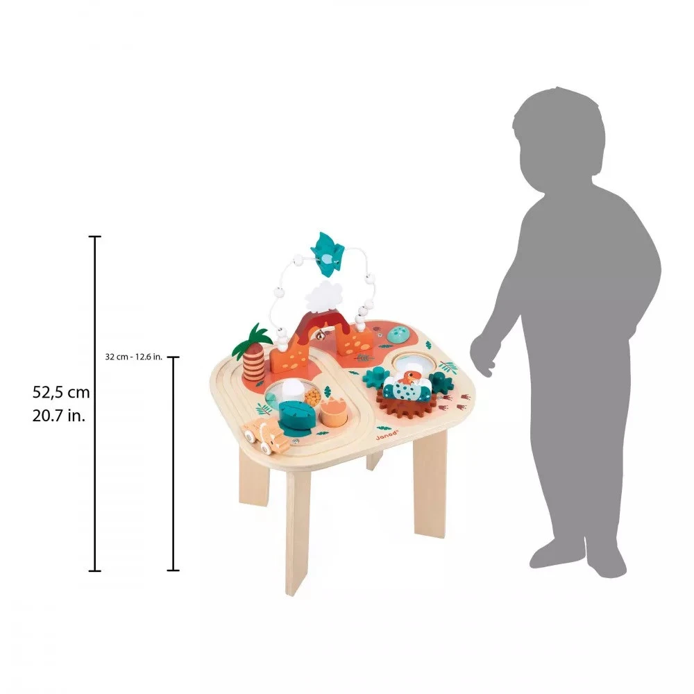 Table d’activités en bois avec 8 jeux d’éveil pour le plus grand plaisir des tout-petits : un boulier, un empilable, un dino à roulettes, un grelot, un oeuf rotatif, des roues à engrenages, un miroir déformant et un oeuf qui fait du bruit.