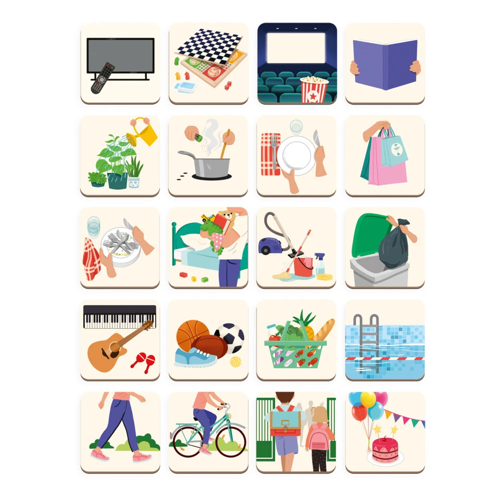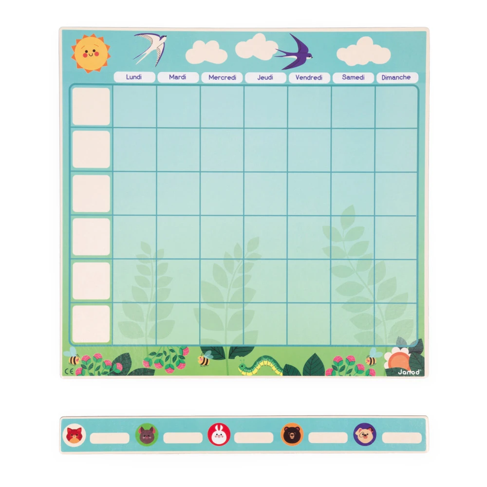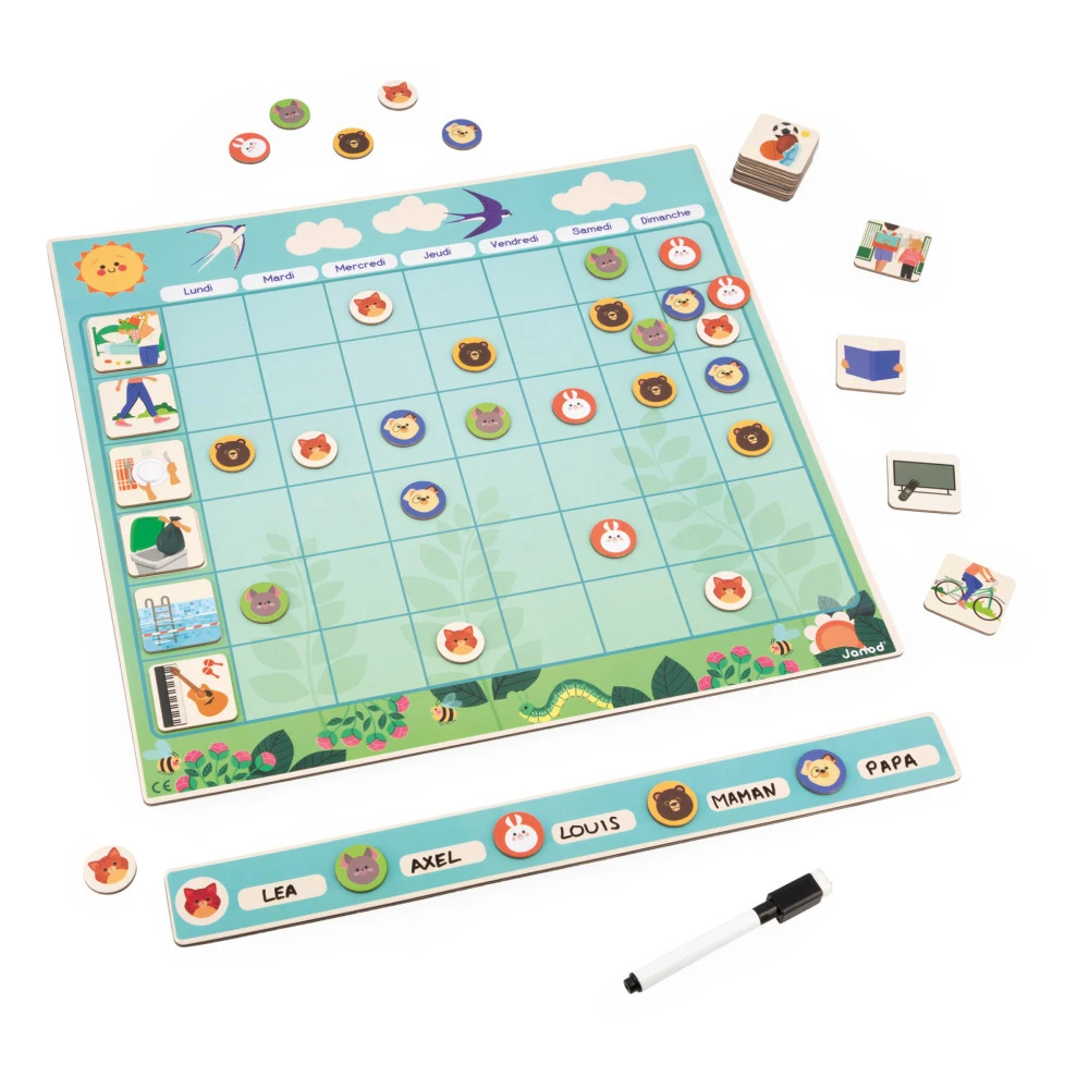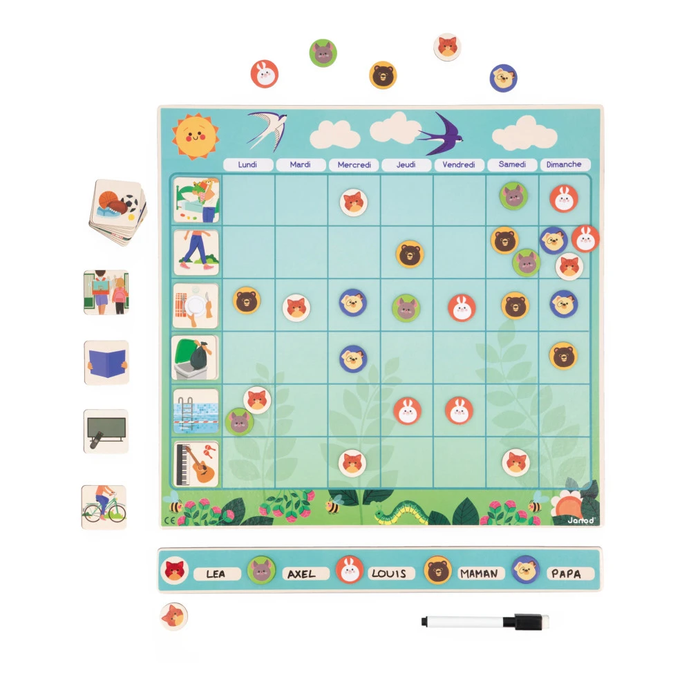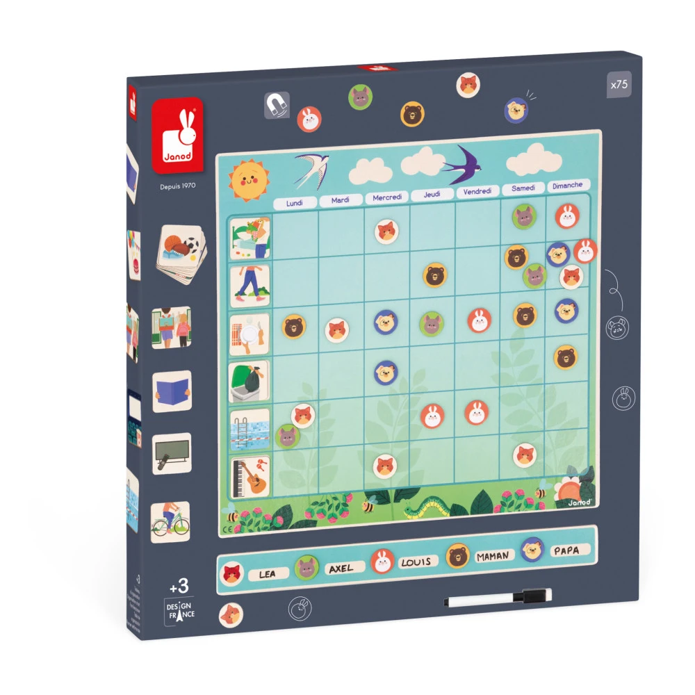 Comprend le tableau en carton aimanté, 20 magnets pour les activités, 55 magnets personnages pour représenter les membres e la famille de façon amusante, 7 stickers pour les jours de la semaine (en plusieurs langues) et 1 feutre effaçable pour écrire les noms en bas du tableau