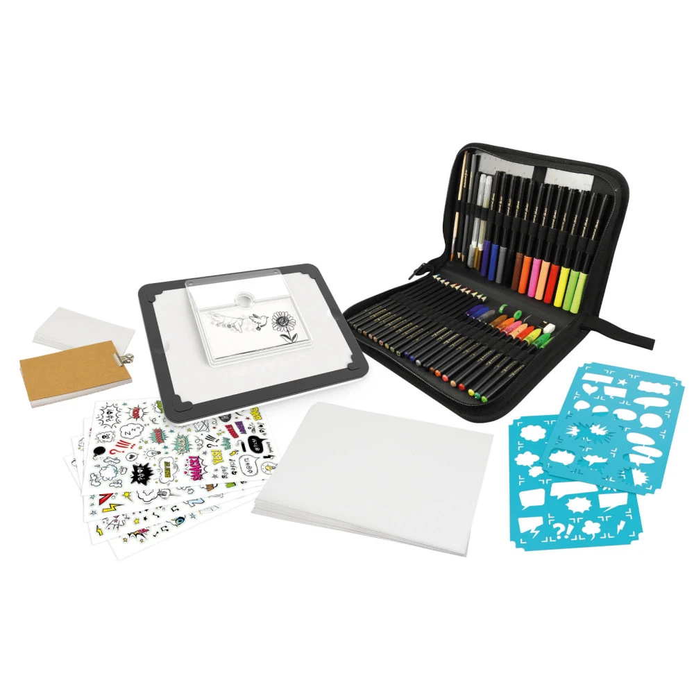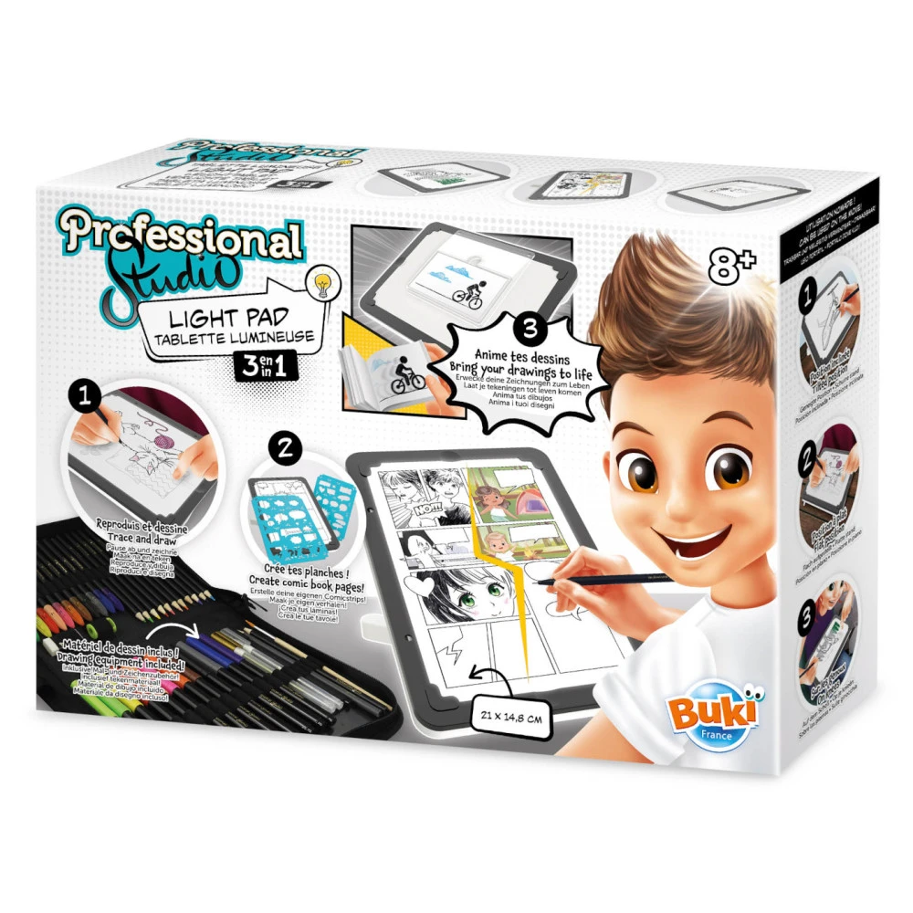 Cette tablette lumineuse avec éclairage LED 3 en 1 de chez Buki France va te permettre de déclaquer et dessiner, de créer des BD et mangas grâce aux pochoirs et stickers et également de créer un flipbook.