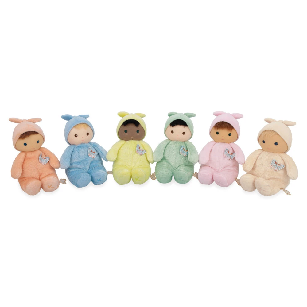 « Tendre Bébé » est une collection de poupons en tissu, tous associé à une fleur et à une couleur : Camélia, Mimosa, Lin,… Ils ont une adorable petite frimousse et un pyjama tout doux dans des coloris pastels.