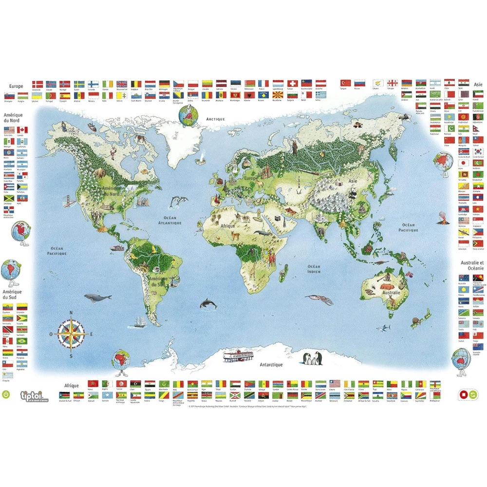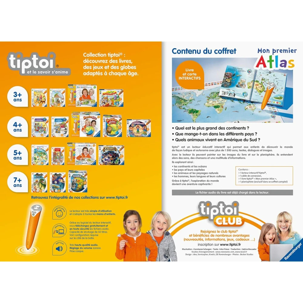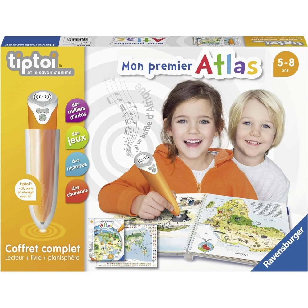 Le coffret « Mon 1er atlas » comprend le lecteur interactif, 1 livre et 1 planisphère et va permettre à l’enfant de partir à la découverte du monde, de ses habitants et de leurs coutumes.