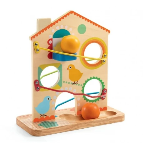 Tout en travaillant sa motricité en plaçant une balle pour la faire dégringoler en bas de la maison des poussins, votre enfant va s’émerveiller du spectacle !