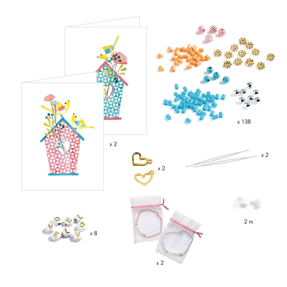 Contenu du coffret : 350 perles, 2 charms, 2 mètres de fil élastique, 2 aiguilles, 2 sacs en organza, 2 cartes illsutrées et 1 livret explicatif