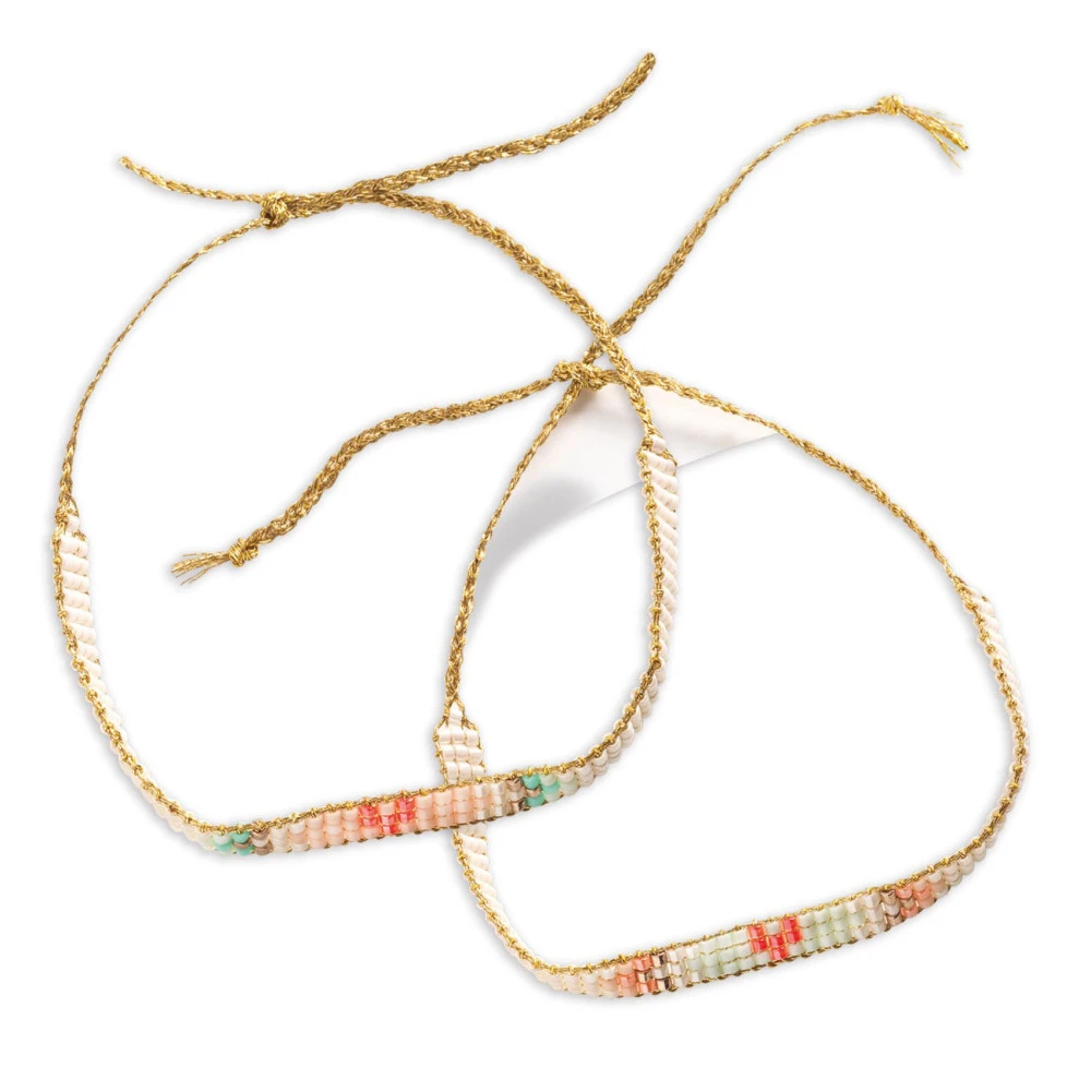 Contenu du coffret : 4 tubes de perles, 4 charms, 1 pince, 1 métier à tisser, 2 fermoirs, des fils, 2 aiguilles, 2 sac en organza, 2 cartes illsutrées et 1 livret explicatif.